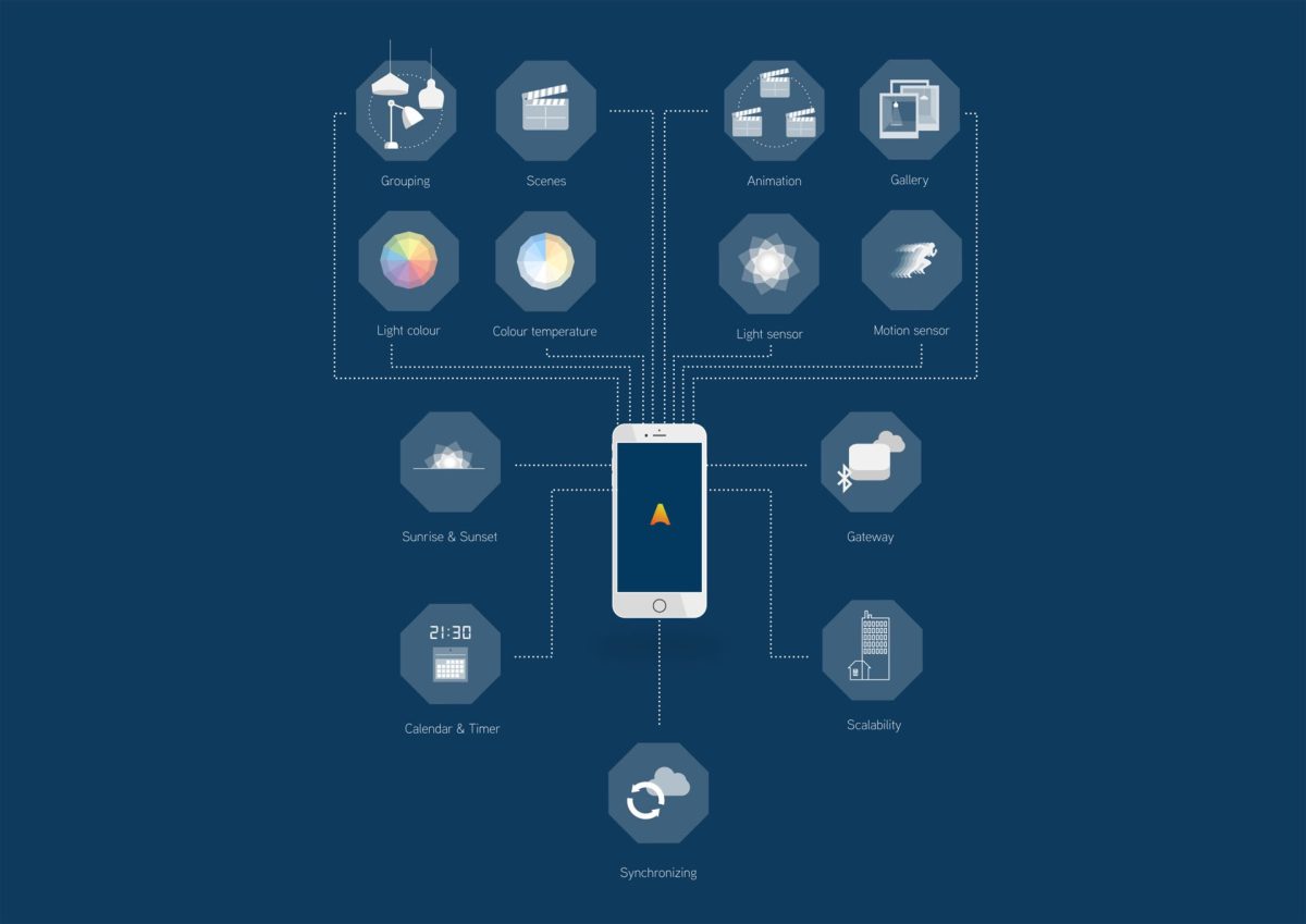 U kunt verschillende scenes aanmaken die u de gelegenheid bieden om specifieke verlichtingsgroepen in te schakelen of te dimmen. Het contact met het systeem verloopt via Bluetooth (Low Energy technologie). Het netwerk is uiterst stabiel en het stelt u in staat de verlichting te bedienen met u telefoon. Natuurlijk is bediening via bestaande schakelaars of een draadloze wandbediening ook mogelijk.